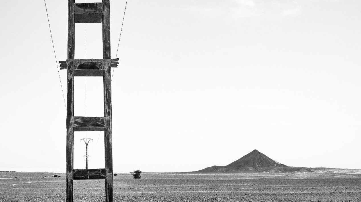 La marca artificial de la línia negra d’asfalt a la sorra en sortir del Tadrart és l’últim que recorrem. L’elegància d’una catifa fosca que talla una manta de sorra de color ivori. Ens commou perquè és clara, neta i gairebé sembla una obra de land art. Dibuixada amb bolígraf, fusionada amb la sorra, els seus límits estan marcats només per un canvi de material i color.